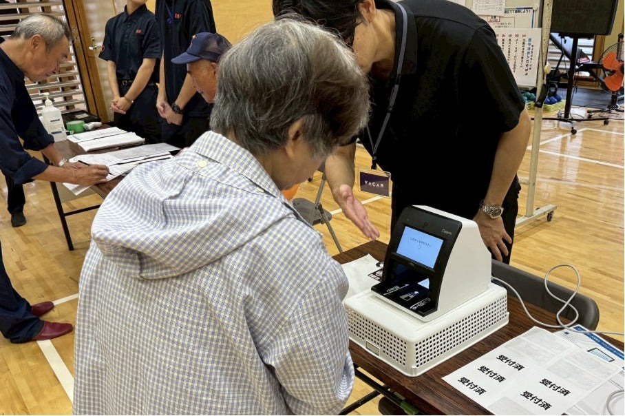 訓練では、バカンが提供する「避難者マネジメントシステム」を活用し、4種類の受付経路を用意。QRコード読取によるWebフォーム入力、マイナンバーカードや運転免許証のカードリーダー利用、LINEでのQR読み取り、そして現行の紙媒体への記入と、住民は自身の使いやすい方法を選択して手続きを体験した。