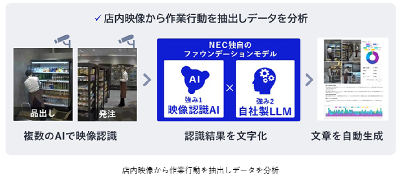 本実証実験では、店舗内に設置したカメラで従業員の作業映像を撮影し、NECが開発した映像認識AIで各作業を自動分類する。さらに、AIが検知した作業項目や所要時間などのデータを、大規模言語モデル(LLM)によって文章化し、定量的なレポートとしてまとめる。このレポートを活用し、従来手作業で行っていた作業分析の負担を軽減し、今後の業務効率化施策の検証材料とする狙いだ。NECは、この仕組みによりローソンが目指す店舗作業の30%削減に貢献することを目指している。