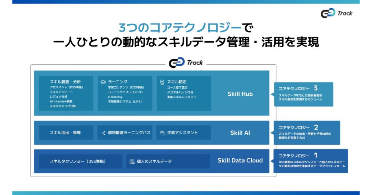 「Track」は、スキルの定義、可視化、育成、実務配置、評価・認定をワンストップで提供する。コア技術は「Skill Data Cloud」によるスキルデータ管理、「Skill AI」によるAI活用、「Skill Hub」による統合機能から成り立つ。主な機能はスキル定義、AIによるスキル調査・分析、個別最適化されたラーニング、スキル認定、スキルベースの人材配置(2025年春リリース予定)など。