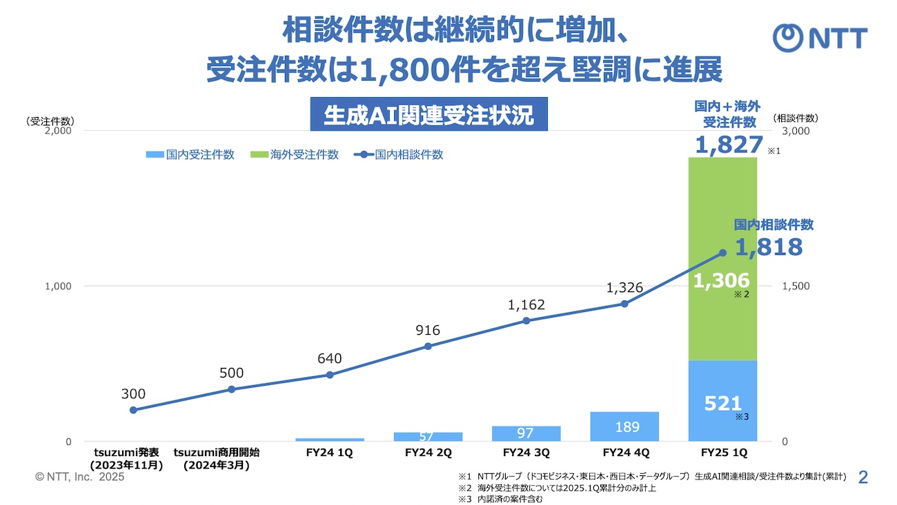 10月20日の記者発表会の冒頭で島田社長は、NTTのAI事業が急速な成長を遂げていることを強調した。2023年11月にtsuzumiを発表して以来、2024年3月の販売開始後、企業からの相談件数は継続的に増加している。受注も堅調に推移しており、国内521件、海外1,306件の合計約1,827件を獲得。自治体などの公共、金融、医療など多様な業界、事業規模の大小を問わず幅広い顧客から採用されている。