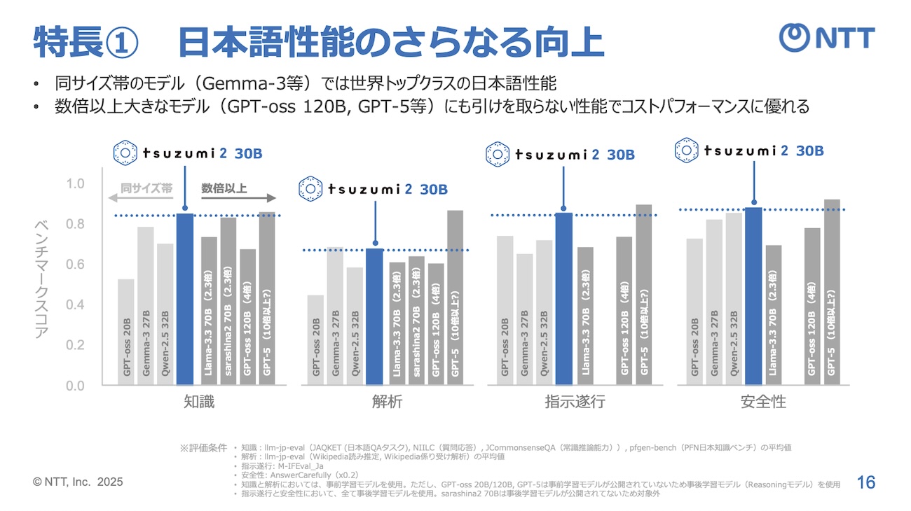 日本語性能については、世界的なベンチマークで評価した結果、同規模のGPT OSS 200億パラメーター、Google Gemma、中国のQwenといった世界トップクラスのモデルと遜色ない性能を示した。さらに、Llama 3 700億パラメーター(サイズで2.73倍)、GPT-4(おそらく10倍以上)と比べても同等の成績を出しており、「非常にコストパフォーマンスの良いモデル」と木下執行役員は自信を示した。