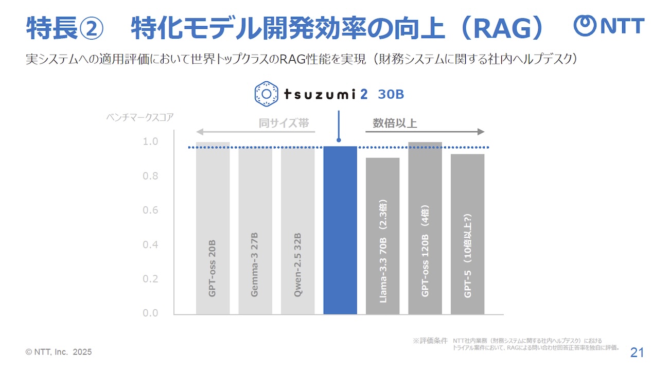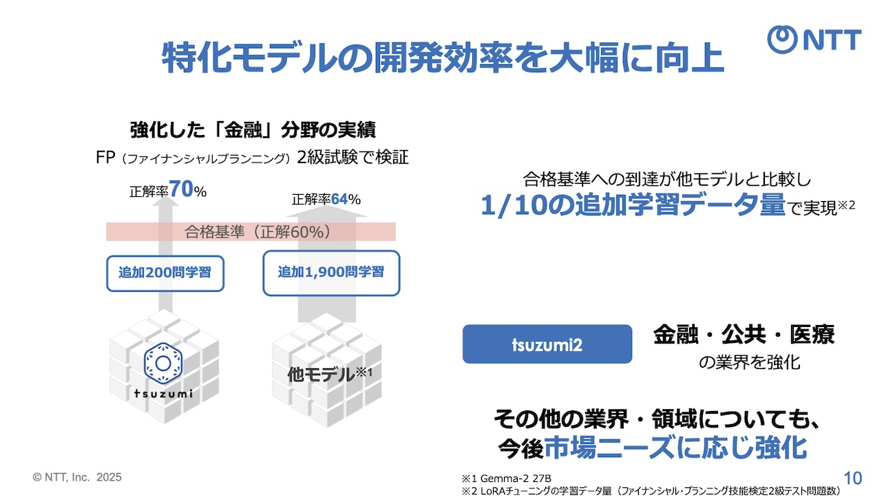 特化型モデルの開発効率も大幅に向上した。ファイナンシャルプランニング技能試験2級を例に挙げ、「tsuzumi 2は200問の事前トレーニングで合格するが、Google Gemmaでは1,900問必要」と説明。金融分野の専門知識を強化したことで、通常の10分の1の学習データでカスタマイズが可能になった。