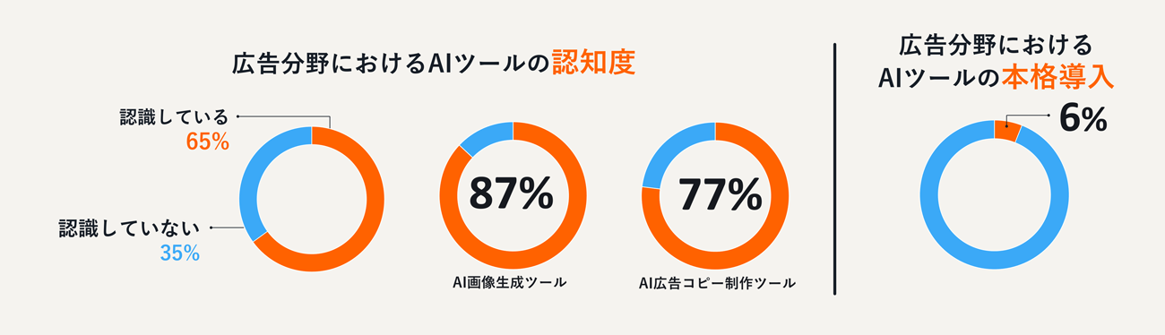 「広告分野におけるAIツールの認知度」の調査では、65%が「認識している」と回答。特に、画像生成やコピー制作といった実務に直結するAIツールは認知度が高く、多くの中小企業が注目している分野であることが判明した。