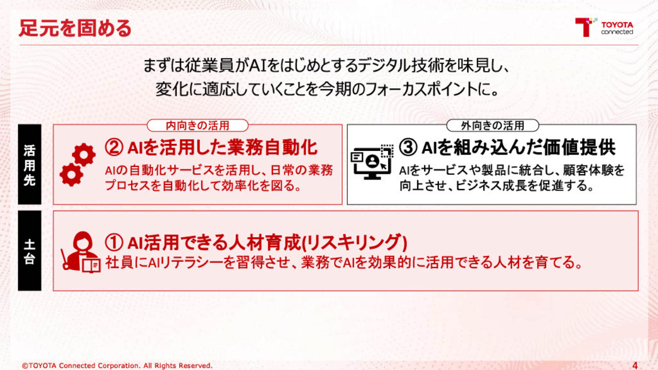 たとえば、当社は自動車のコールセンターを保有していたり、テレマティクス技術を用いた複数のアプリを展開したりしていますが、将来的にAI機能を組み込もうとした際、AIを触ったこともない人がいきなりチャレンジするのは難しいでしょう。