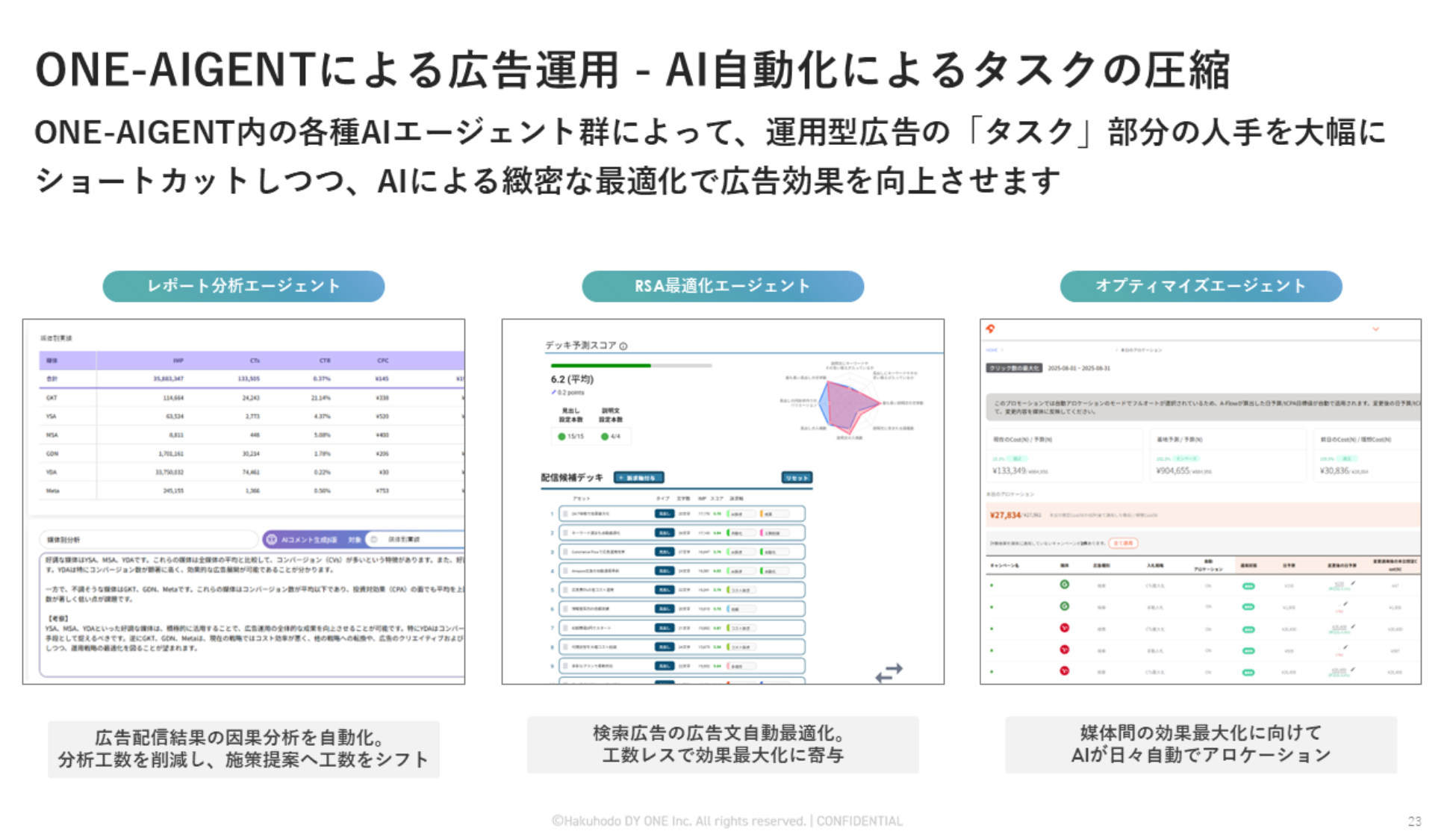 デジタル広告のAIエージェント型のサービスというのは、どういうものなのかの現時点での答えが「ONE-AIGENT」です。リリース時点では主にAIエージェント型広告運用、生成AIを駆使したクリエイティブ制作、そしてお客様のAIエージェント構築支援の3本柱のサービスを発表しています。