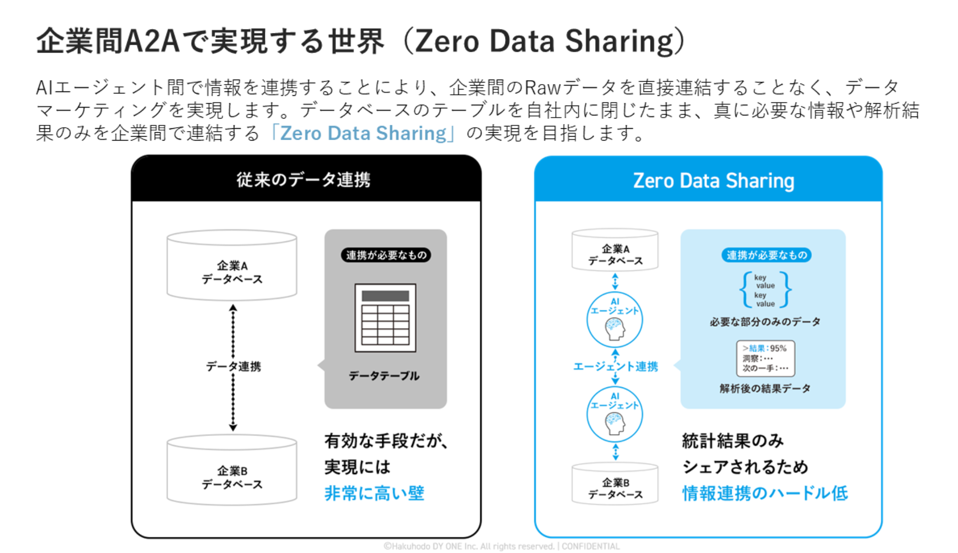 一方で、広告主側にAIエージェントがあれば、「今の条件にあてはまるのはなんですか」と投げかけ結果だけもらえばよいのです。この結果は機密データにはならないので、データ連携のハードルが下がると考えています。まさに「Sharing」はするが、データは渡さないので「Zero Data」という名づけをさせていただきました。