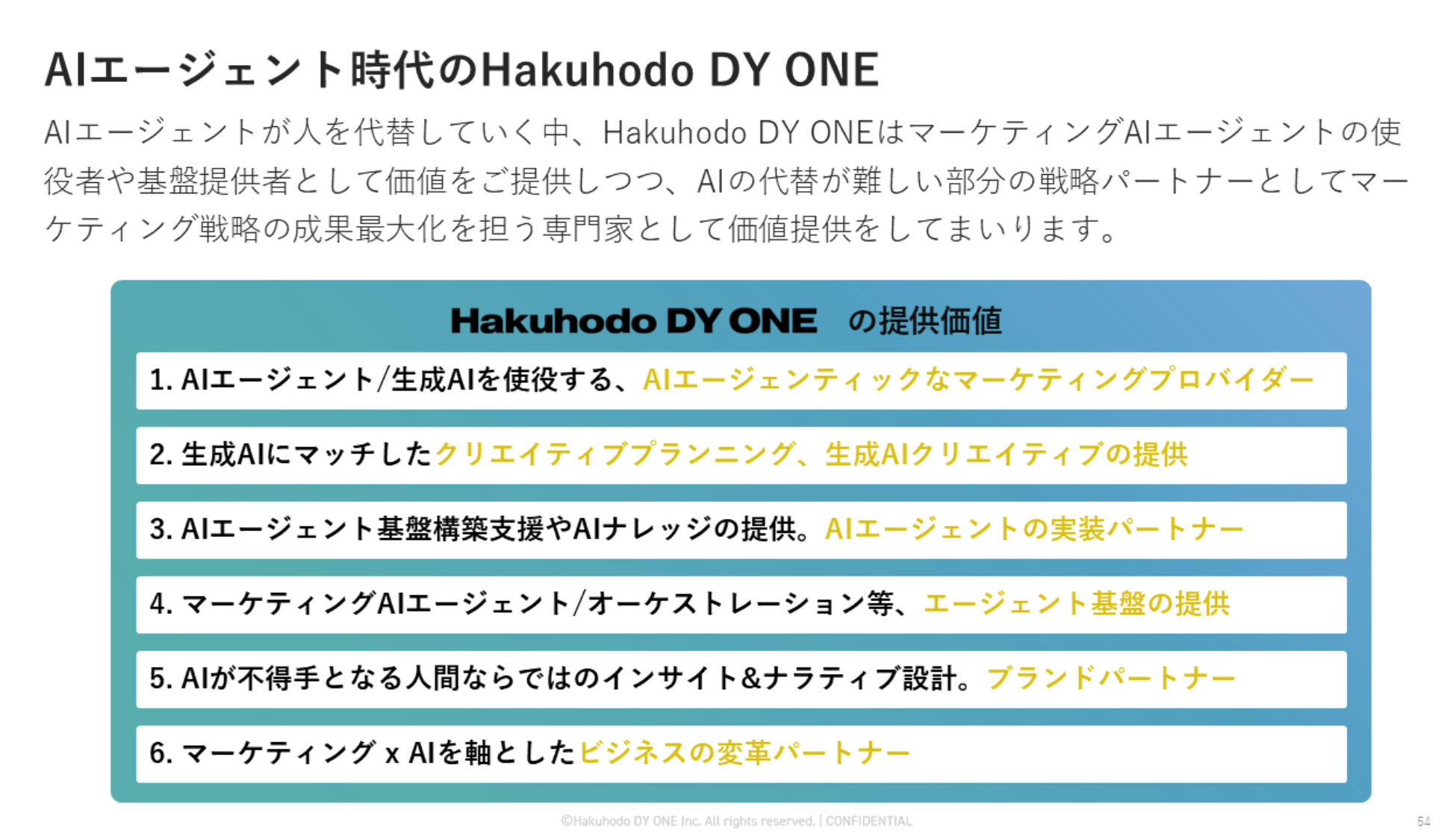 柴山:「ONE-AIGENT」は、博報堂DYグループのデジタル広告を支えるHakuhodo DY ONEが、AI時代のデジタル広告領域において、どう新たな価値を創るのかのメッセージを全て詰め込んだものです。デジタル広告の世界は、テクニカルな部分がフィーチャーされてきましたが、そういった部分はAIが担うからこそ、今後は「マーケティングとは何か、ブランドとは何か」という根源的な問いに立ち返ることになると思いますし、ブランドの一貫性やナラティブ設計といった人間ならではのクリエイティビティの重要性が問われてきます。