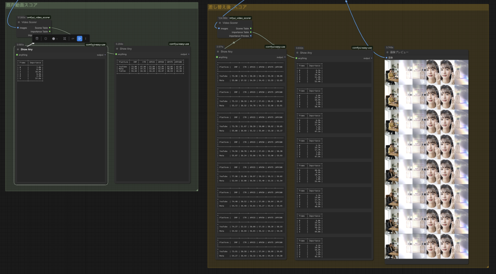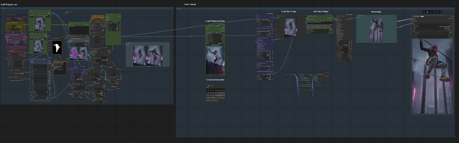 たとえば、「テキストから開始フレームの静止画を作るノード」「終了フレームを作るノード」「その間を動画として補完するノード」「人物の動きを制御するノード」「解像度をアップスケールするノード」といった具合に、処理を部品化し、線でつないでいく。作業手順書をプログラム化したようなイメージですね。