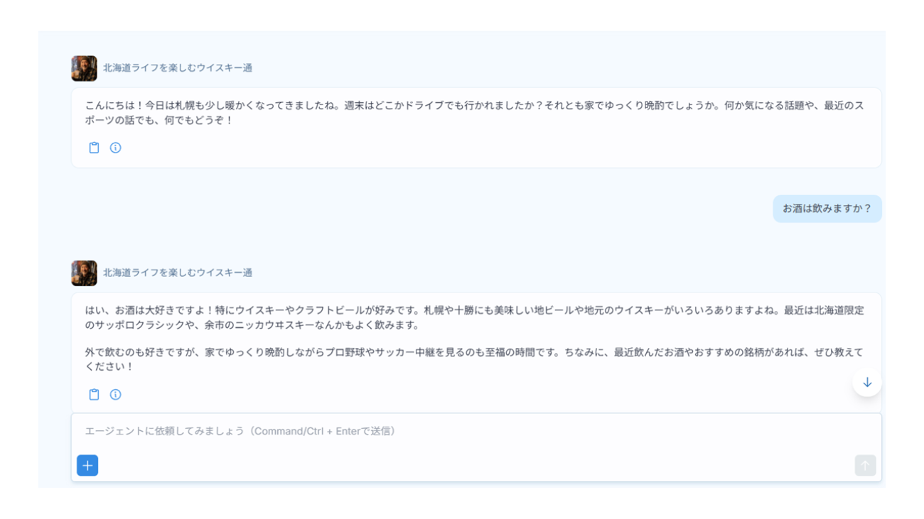 これにより、TDMで描き出した「週末ドライブが楽しみなゲーマー主婦」「北海道ライフを楽しむウイスキー通」といったペルソナと、24時間いつでも対話できる環境が作れます。リアルなAIペルソナに対して、企画の壁打ちやコピー案・クリエイティブの評価、キャンペーン設計などを行えます。