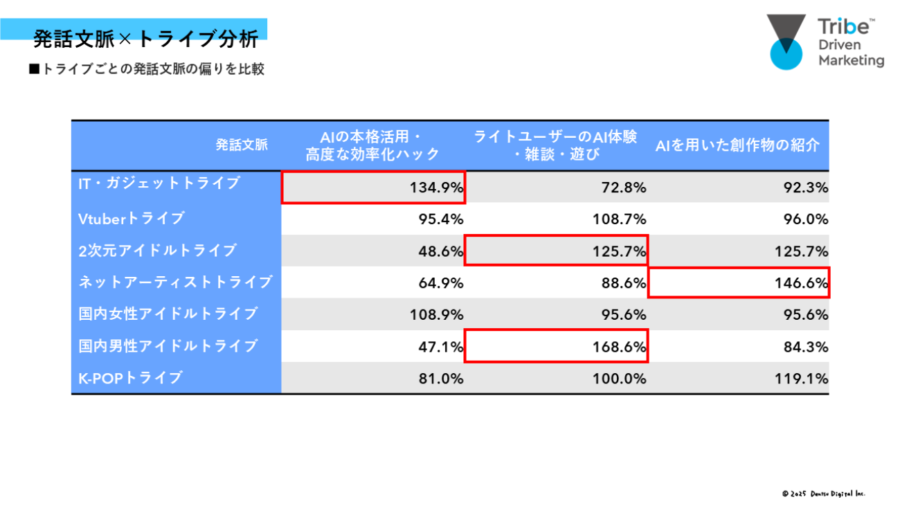 矢部:続いて、同じ投稿データを用途や文脈で分類しました。本格活用(情報発信のために使う)・雑談活用(遊びとしてチャットする)・画像生成(画像生成に使う)の3パターンに分けたところ、IT・ガジェットトライブでは本格活用に関する発話が多く、アイドルトライブは雑談系、ネットアーティストトライブは画像生成が多い、といった特徴が見えてきました。ここまで分かると、訴求施策や活用媒体も、トライブごとに設計しやすくなるのではないでしょうか。
