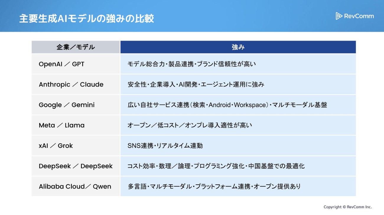 昨年までは米国企業が一歩リードしていましたが、今年は中国企業も急成長した年でした。各社の戦略は明確に分かれており、総合力、安全性、既存サービスとの統合、オープンモデル、低コスト化など、それぞれの強みで差別化を図っています。