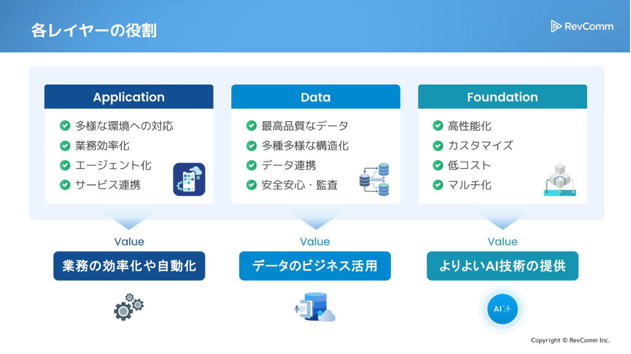 - 役割:多種多様なデータを構造化し、生成AI活用に適したプラットフォームを構築する。また、データの価値抽出と競争資源化を促進する