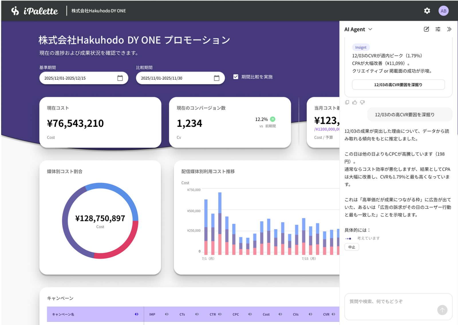 柴山:はい。現在は専用のリーズニングモデル(推論モデル)を組み込んでおり、エージェント形式で複数のAIを走らせることで、より深い洞察が可能になっています。たとえば「コンバージョンレートが改善した要因を深掘りして」と投げかけると、「CPCは高騰したが、配信面が絞り込まれたことで送客の質が高まったため」といった多角的な回答を返します。