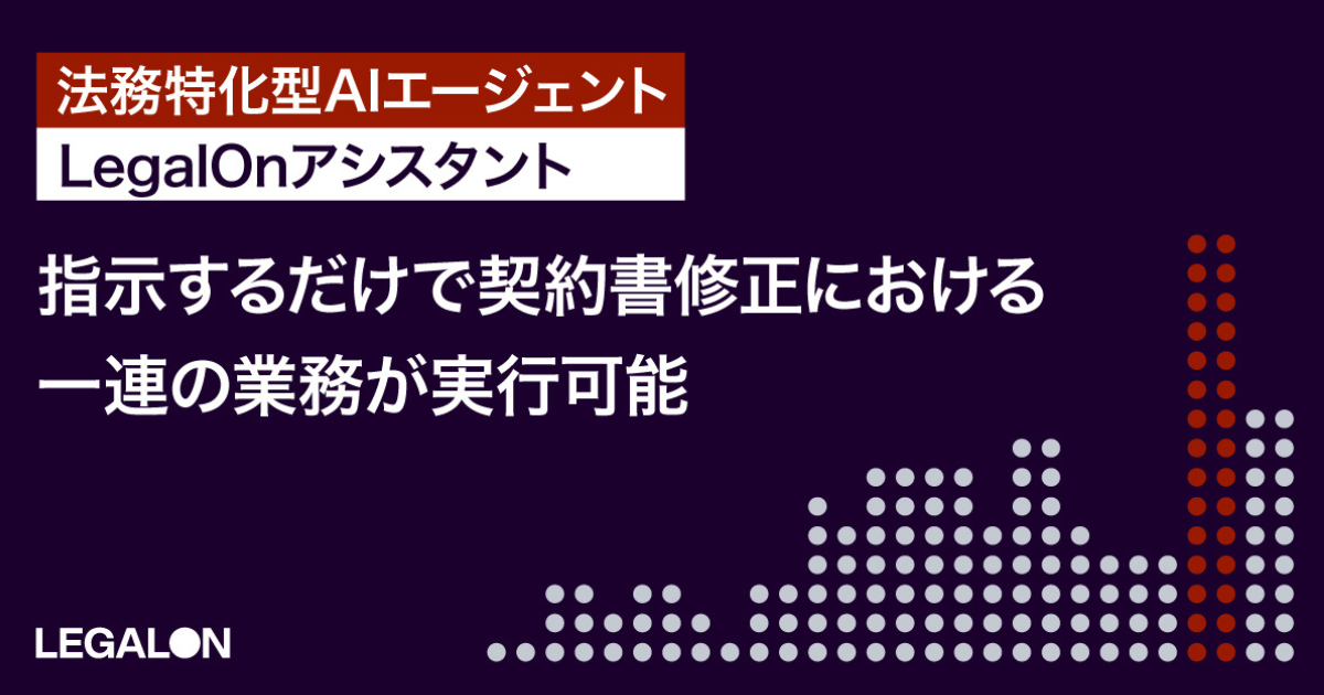 LegalOn Technologies提供の「LegalOn: World Leading Legal AI」において、法務特化型AIエージェント「LegalOnアシスタント」に指示するだけで、契約書の修正案の検討、条文への反映までの一連の業務が実行可能となった。これにより、契約書レビュー業務をAIとともに進められる。