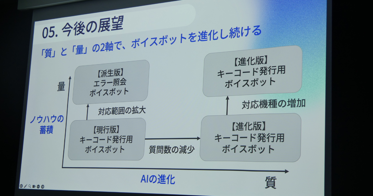 内藤:私たちは導入したAIエージェントによって、さまざまなノウハウが得られます。それをもとに自社の中で適用範囲がどんどん増える。つまり「量」が増えるんです。実際、当社ではキーコードの発行とは別の領域で、新たにボイスエージェントを導入しています。これが量の変化です。一方で、AIエージェントそのものが進化していきます。さらにそれが、量の変化と掛け合わされて、どんどん可能性が広がっていくイメージを描いています。