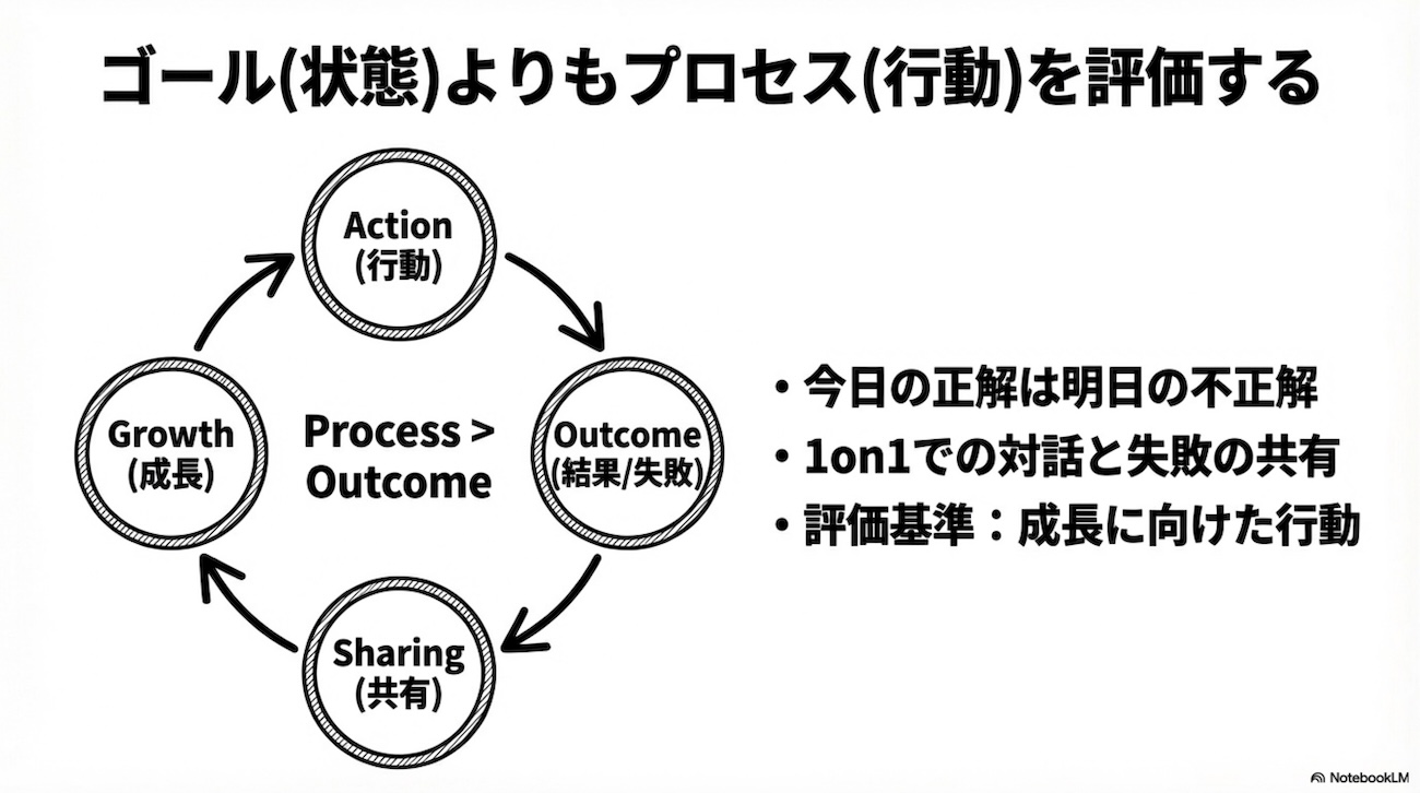 期初の1対1面談(1on1)で役割と目標を合意し、期中はカルテの作成状況をフォローアップしながら、時間が取れない・事業部がヒアリングに応じてくれないなどの障害があればマネージャーが除去を支援する。期末の振り返りでは、仮に相談相手として成果が出なくてもカルテ作成という行動をしっかり行っていれば行動評価として認め、支援があったにもかかわらず行動が不足していればエビデンスに基づいて評価を下げる。「なすべきことに集中でき、なすべきことをなせば評価される」環境の仕組み化が狙いだ。