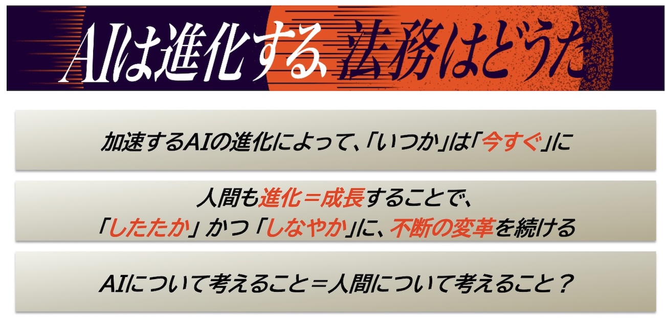 自分たちの軸をしたたかに持ちながら変化にしなやかに対応し、成長し続ける組織になる──これが「AIは進化する、法務はどうだ」という問いへの、根橋氏なりの答えだと語った。