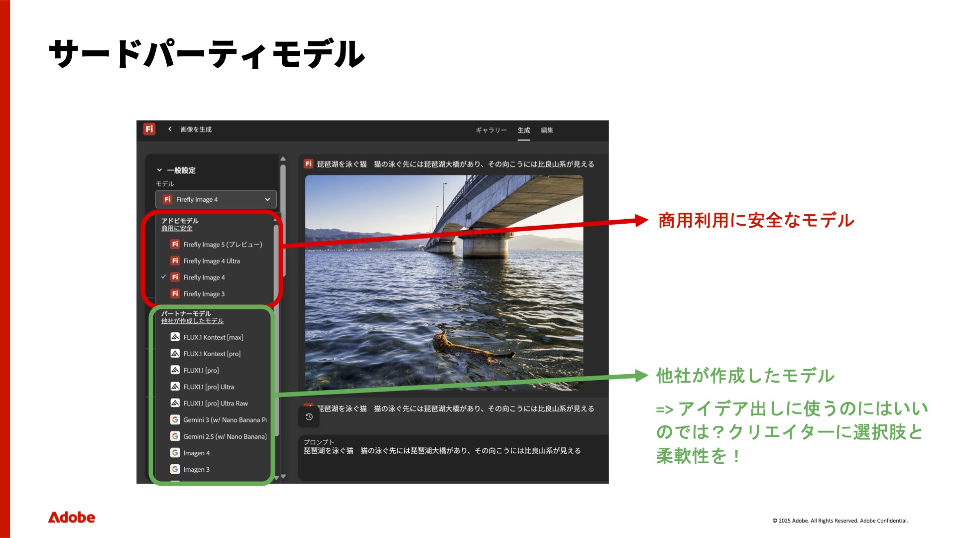 またFireflyボードでは、アドビのツールだけでなくサードパーティのモデルも選んで試せます。画面を切り替えずにいつものワークフローの中で使えるので、思考が中断されない。そしてアイデアが固まったらAdobe PhotoshopやAdobe Illustratorでの本格的な制作にシームレスに移行できます。「競合ではなく共存」という考え方ですね。