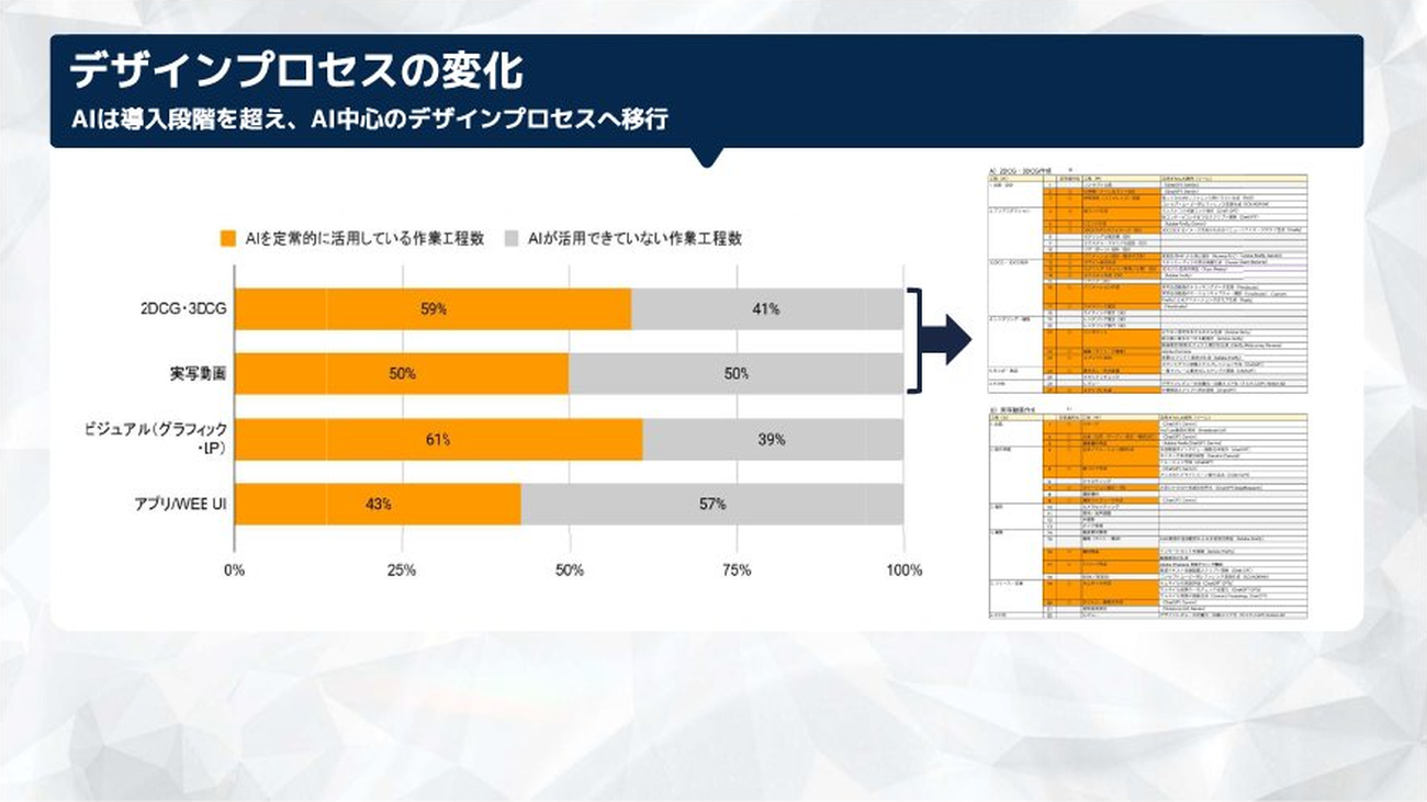 CDO 横山:デザイナーにおいては、目標を立てる前の期がAI浸透率17%程度だったので、今回は30%程度かと思っていました。しかし実際には、代表的な職能で40%~60%までAIが浸透しています。一つの工程で一つ、二つ、三つとAIを使っています。現場は積極的に楽しんで取り組んでいるようです。
