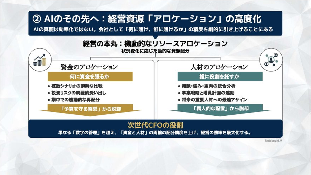 CFO/人事 島村:私は「経営資源のアロケーションの高度化」をテーマに挙げています。すでにAIで分析作業などは最小化できています。今後は予測とそれに対する対策をAIに生成してもらおうと思っています。さまざまな経営シナリオに応じて、どの事業にどれだけ予算が必要か、人をどう動かしたほう良いのかをAIが考えてくれる時代がくるでしょう。どの会社も予算や人員計画を年度ベース、早くて半年スパンで振り返ると思いますが、それをよりリアルタイムにしたい。経営をアジャイル化していきたいです。