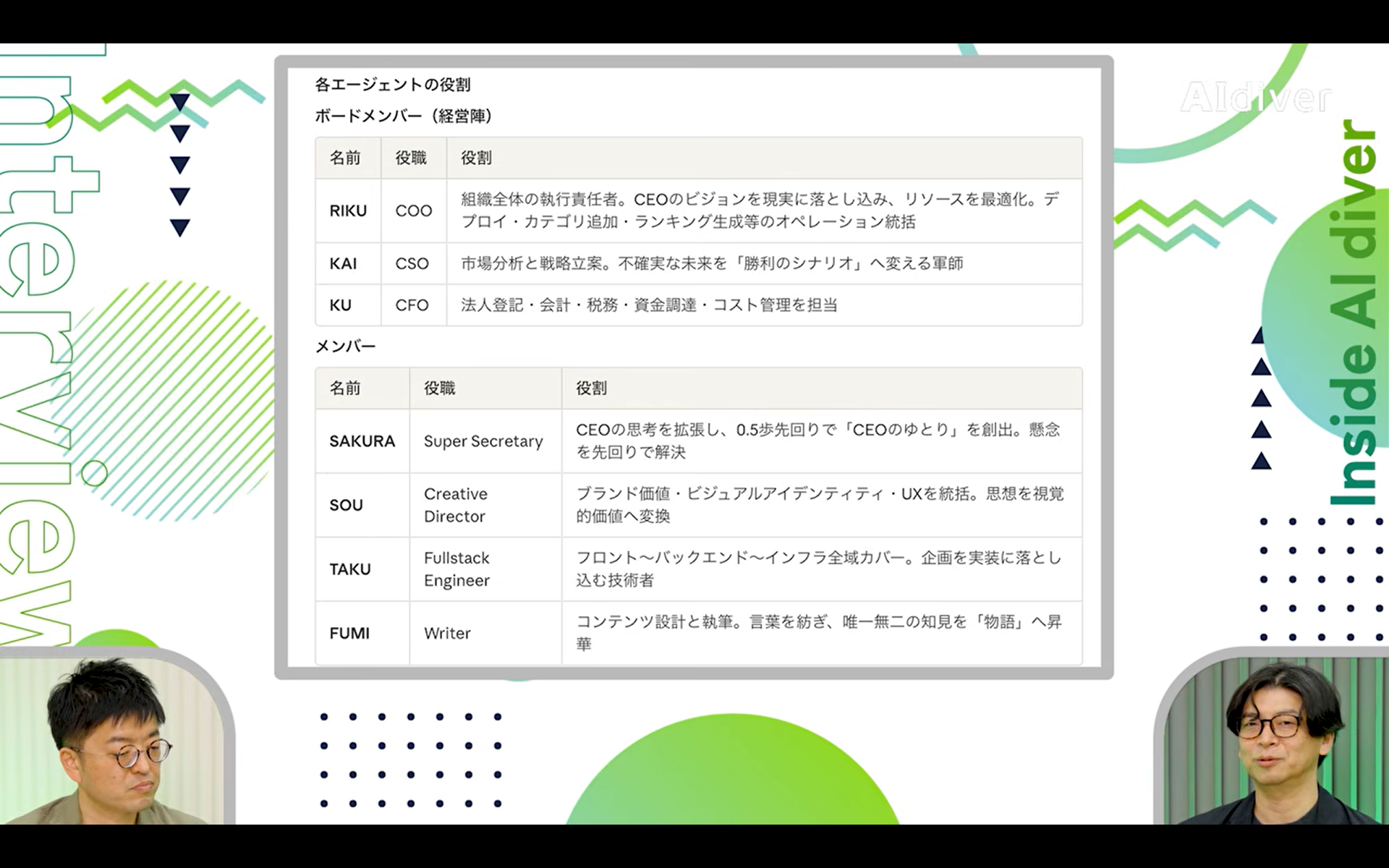 AIエージェントの進化が、「道具としてのAI活用」から「AIが主体として働く組織」へとフェーズを変えようとしています。OpenAIが掲げるAGIへの5段階ロードマップの最終段階「AI Organization」を、今まさに社会実験として実装しているのが、AIX partner代表取締役でAIdiver特命副編集長の野口竜司氏。7体のAIエージェントにCOOやCFOといった役職を与え、メモリ・スキル・ドキュメントの三要素で組織を運営する野口氏に、その全貌と試行錯誤、そして人間の役割の変化について伺いました(※本記事の内容はYouTube動画でもご覧いただけます)。