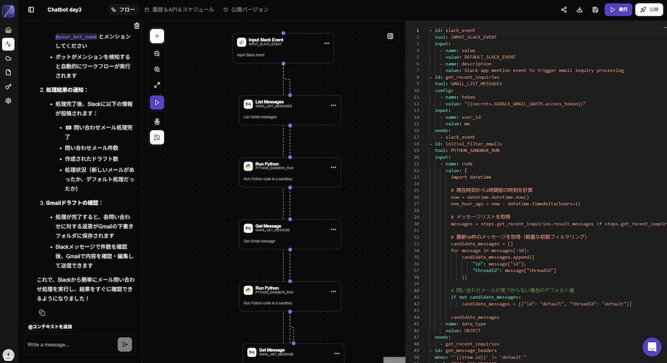乗杉:最初に開発し、パブリックで公開しているのが「jinbaflow」です。これは自然言語でiPaaS(Integration Platform as a Service)を実現するツールで、たとえば「こういうメールが来たとき、この内容をスプレッドシートに書き起こして保存してほしい」といった指示を出すと、裏側で業務ワークフローが自動構築されます。Difyのようなノードやモジュールが可視化されて組み上がっていきますが、jinbaflowでは最終的にTypeScriptのコードとして確定処理されるため、型安全で堅牢な決定論的業務自動化が実現できるのが強みです。現場の担当者やエンジニア志向のユーザーが、直感的に業務プロセスを設計でき、しかも安心して運用できる点にこだわっています。
