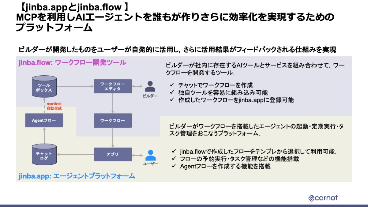 私たちCarnotでは、この課題を本気で解決しようと考えました。jinbaシリーズでは、プロトタイピングや試行錯誤の段階では生成AIの柔軟性を活かしつつ、最終的にはTypeScriptなどで確定的なロジックや業務フローに落とし込む仕組みを実装しています。これにより、不確実性の高い部分と厳格に管理すべき業務ロジックの双方を両立させることができる。「安心して本番運用できるAI自動化」を、現場の使いやすさと同時に実現しているのが特徴です。