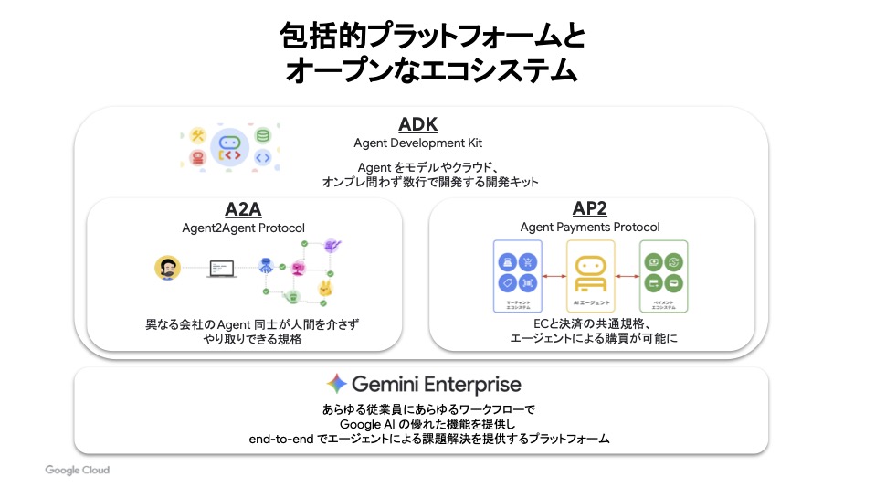 Googleは、エージェントのエコシステムをオープンに保つ姿勢を明確にしている。寳野氏は「我々のエージェントの考えというのは決してクローズドではない」と述べ、Agent Development Kit(ADK)を中心としたオープンスタンダードの確立に注力していることを強調した。A2A(Agent to Agent)プロトコルに対応すれば、どのエージェントでも協調して動作可能だ。ADKを使って作成したエージェントは、どのモデルやクラウドを使っていてもGemini Enterprise上で管理・運用できる。さらに、AP2(Agent Payments Protocol)により、エージェントによる購買も視野に入れている。
