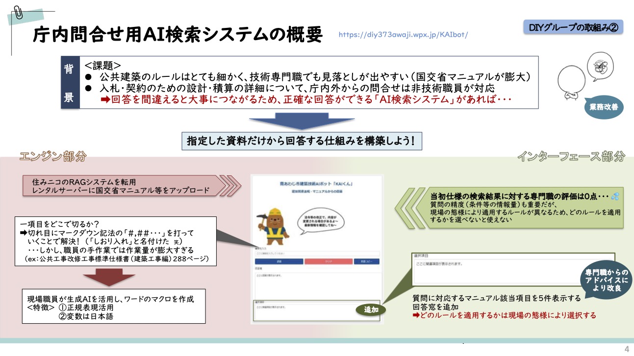 具体的な成果として、移住支援サイト「住みニコ」内のAI検索システムをRAGの原理を使って開発し、利用者の意図に沿った回答を提供できるようにした。また、ゴミ分別ガイド「わけるんです♪」では、担当者が切望していたゴミ分別アプリを開発した。生成AIがなければ完成していなかったという。市長は「職員の余力を生み出して、住民とのより丁寧な対話や課題への対応、ワークライフバランスに振り向けたい」と今後の展望を語った。