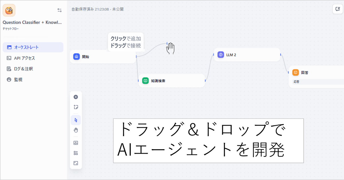 Dify Enterpriseは、専門的なプログラミング知識がなくてもAIエージェントを容易に開発できる基盤である。ドラッグアンドドロップなどの直感的な操作により、チャットボットやコンテンツ生成、ワークフロー自動化など多様な業務に対応したAIエージェントが構築可能となる。利用者は社内マニュアルや規定など自社独自の情報をAIに参照させ、より業務に即した正確な回答を得ることができる。これにより、事業部門の担当者が自身の業務に適したAIエージェントを迅速に開発できるようになった。