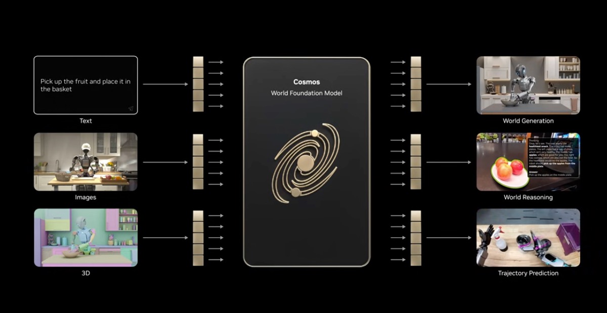 Alpamoの学習を支えるのが、ワールド基盤モデル「Cosmos」だ。フアンCEOは「言語の基盤モデルではなく、世界の基盤モデル」と表現した。