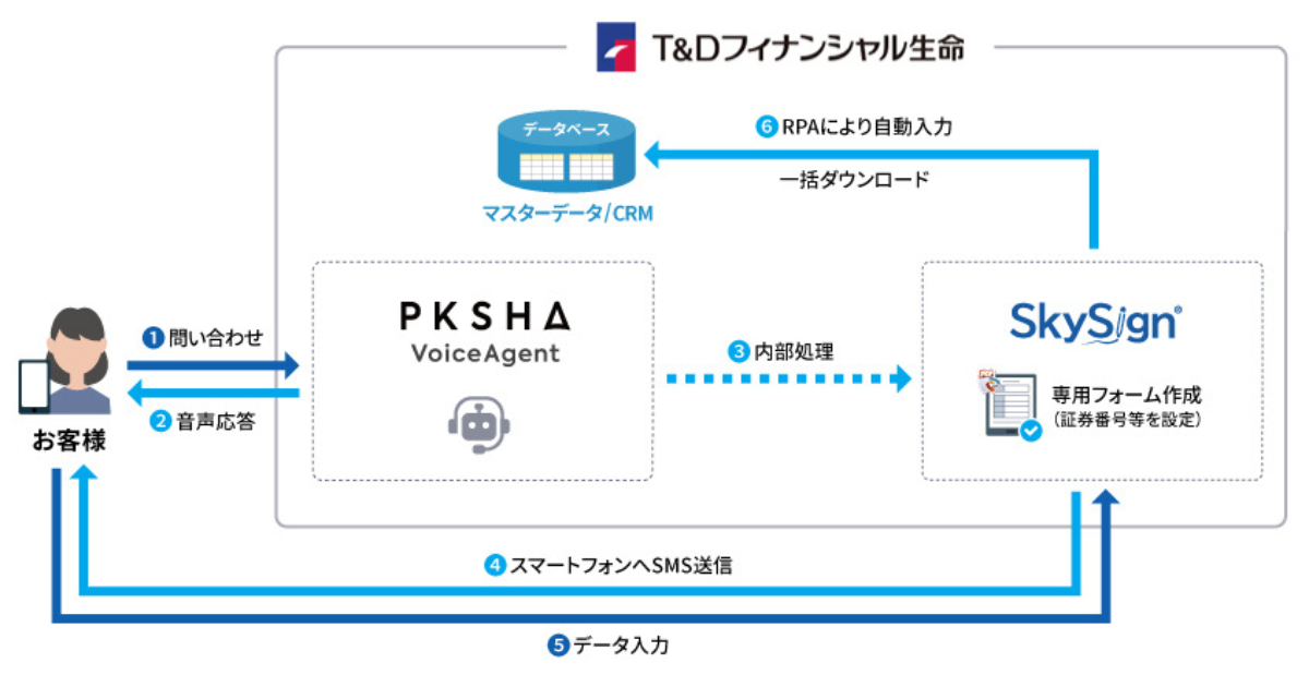 顧客が専用ダイヤルに電話すると、「PKSHA VoiceAgent」が用件確認や案内を自然言語で対応する。その後、スカイコムの「SkySign」から手続き用のURLがSMSでお客様のスマートフォンに送信される。顧客は受信したURLから専用フォームにアクセスし、必要事項を入力することで手続きを完了できる仕組みとなる。これにより、待ち時間や書類作成の手間を軽減し、オペレーター業務の効率化を図る。