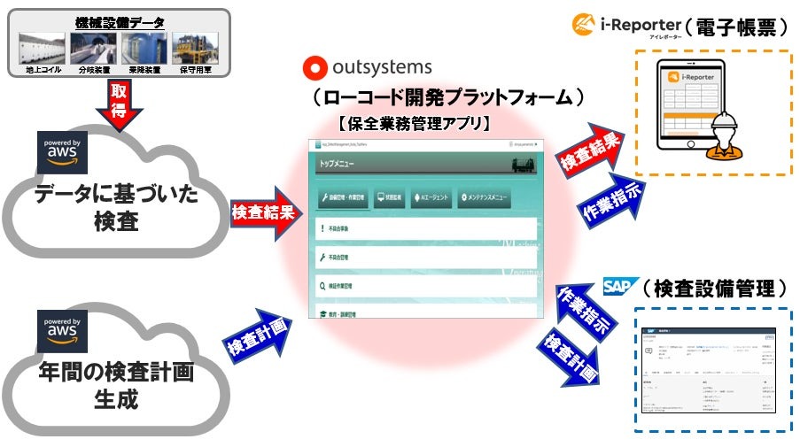 両社が開発したアプリケーションは、「SAP EAM」と「i-Reporter」を連携し、「OutSystems」上で定期検査結果や機械設備の不具合事象を管理できる。定期検査の一部を機械設備のデータに基づき実施し、検査結果を帳票に自動で反映。また、生成AIが定期検査計画を策定するとともに、作業者への作業指示が自動で作成されるとのことだ。